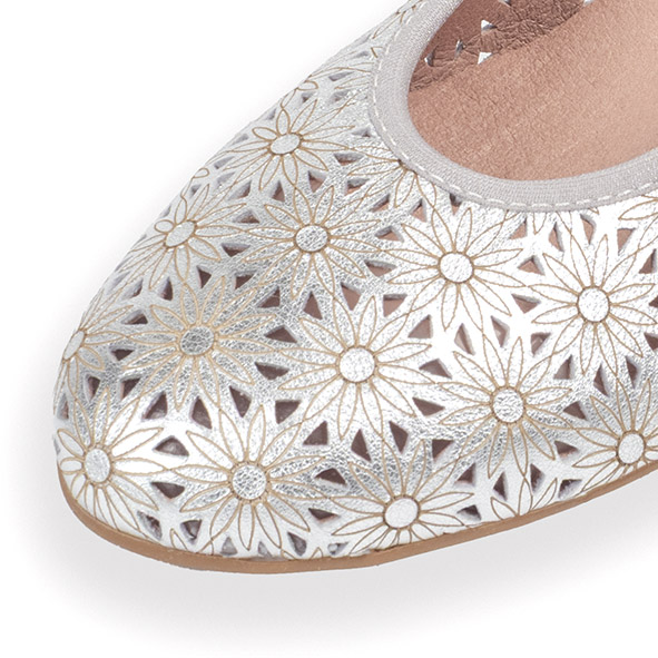 Salón en piel de Pitillos picado con estampado floral y con un tacón cuadrado y bajo. Talonera reforzada.