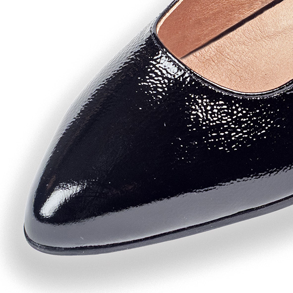 Salón en piel en negro charol de Pitillos con detalles de hebillas y tacón fino y bajo.