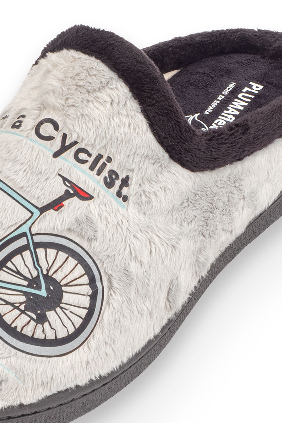 Zapatilla de estar por casa para hombre con dibujo de bici y destalonada con copete en la pala para mayor comodidad. Con plantilla extraible confort de Plumaflex. Material: Tejido invierno