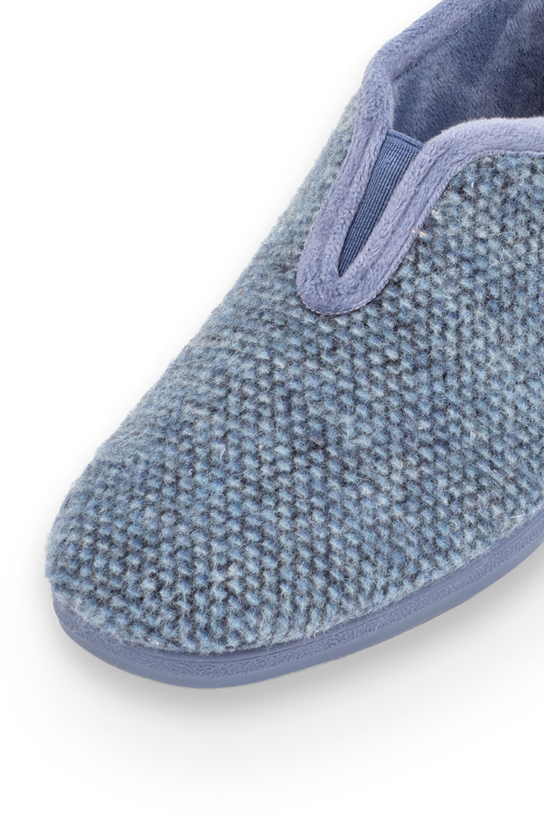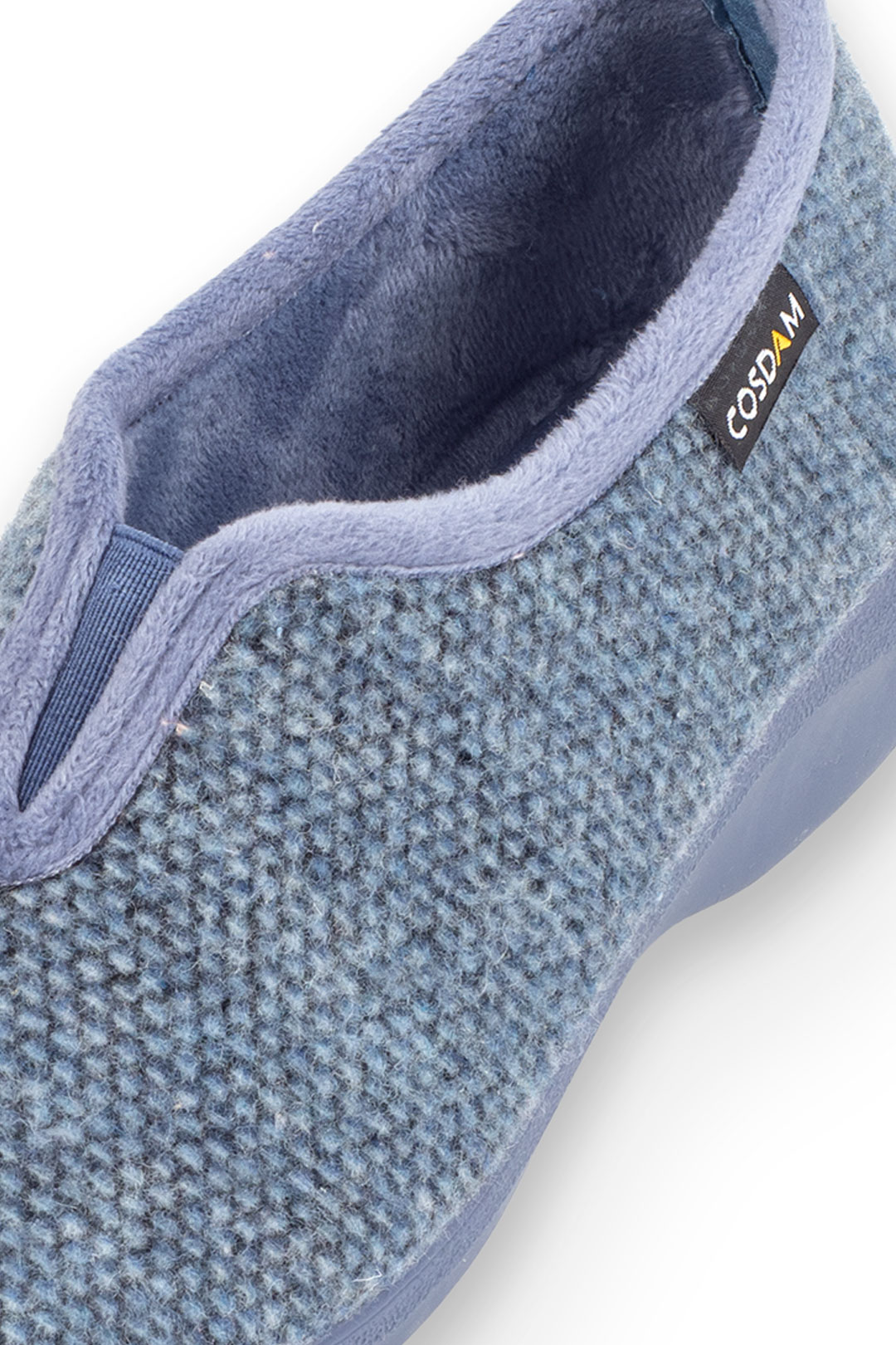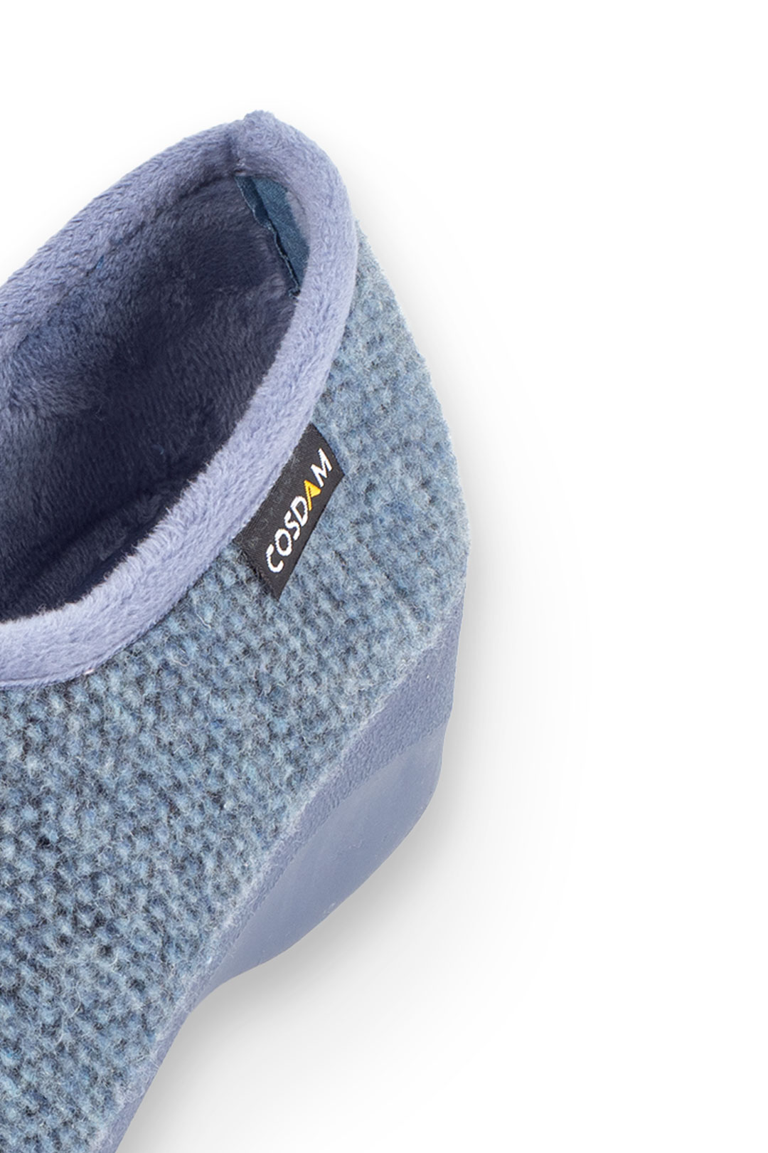 Zapatilla para estar por casa cerrada con cuña y con corte en la pala y elástico para mayor confort y descanso.