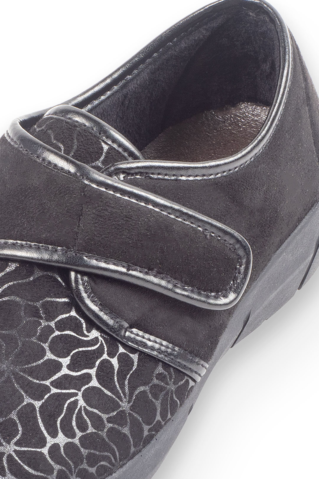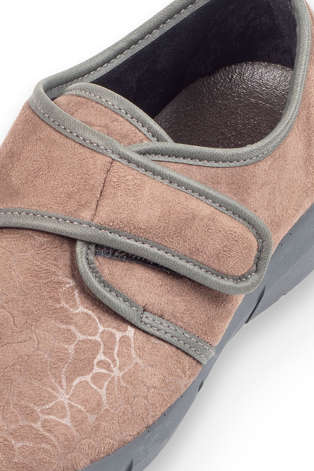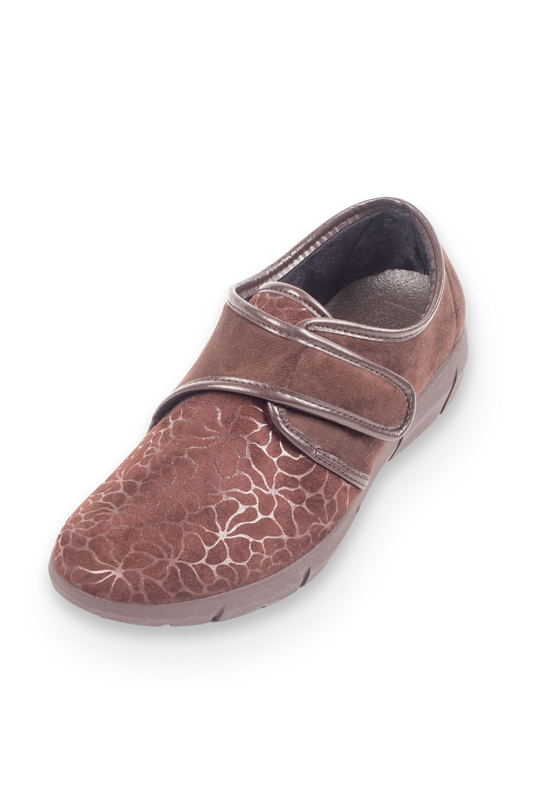 Zapatilla clásica estampada en varios colores con velcro y una ligera cuña para mayor comodidad.