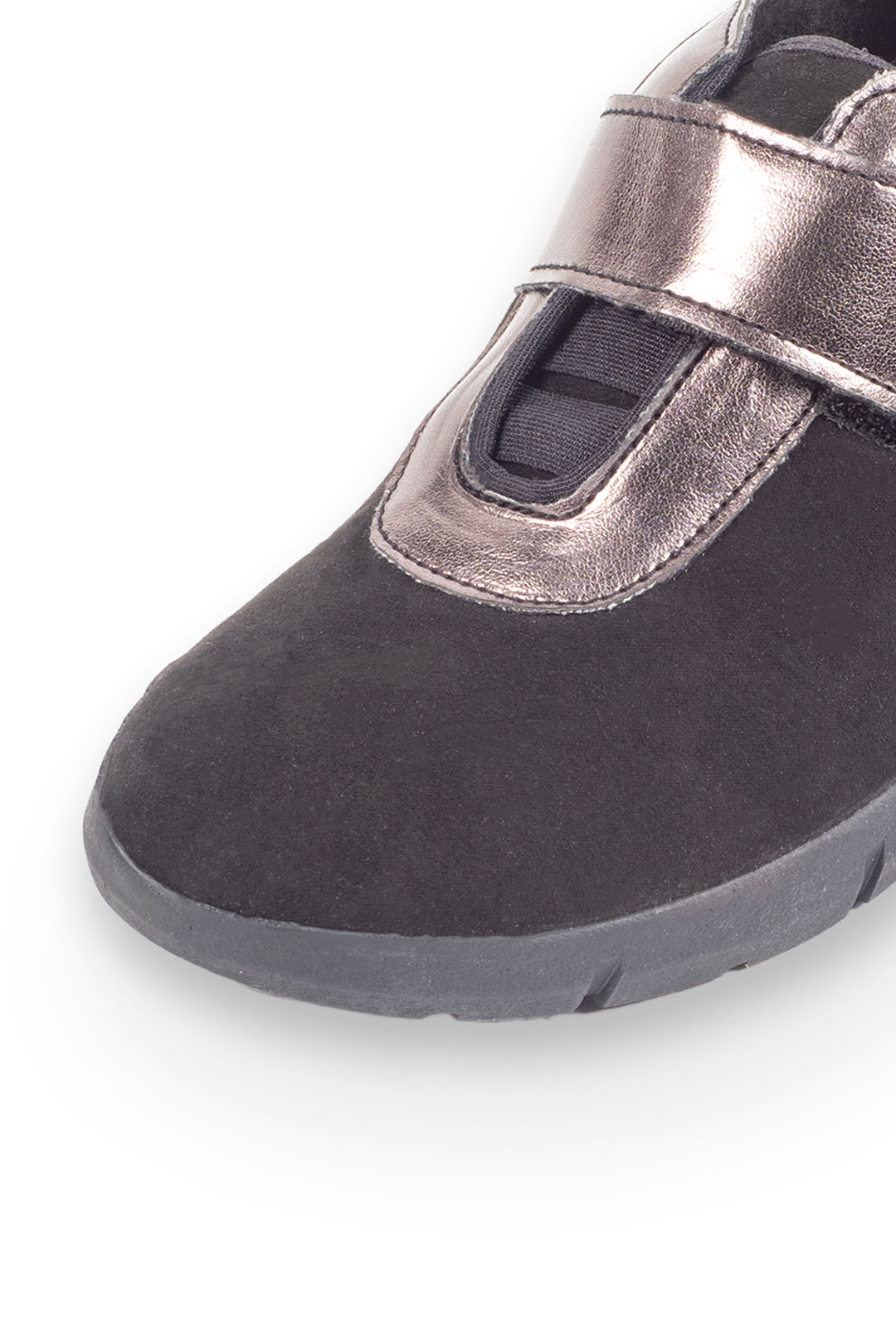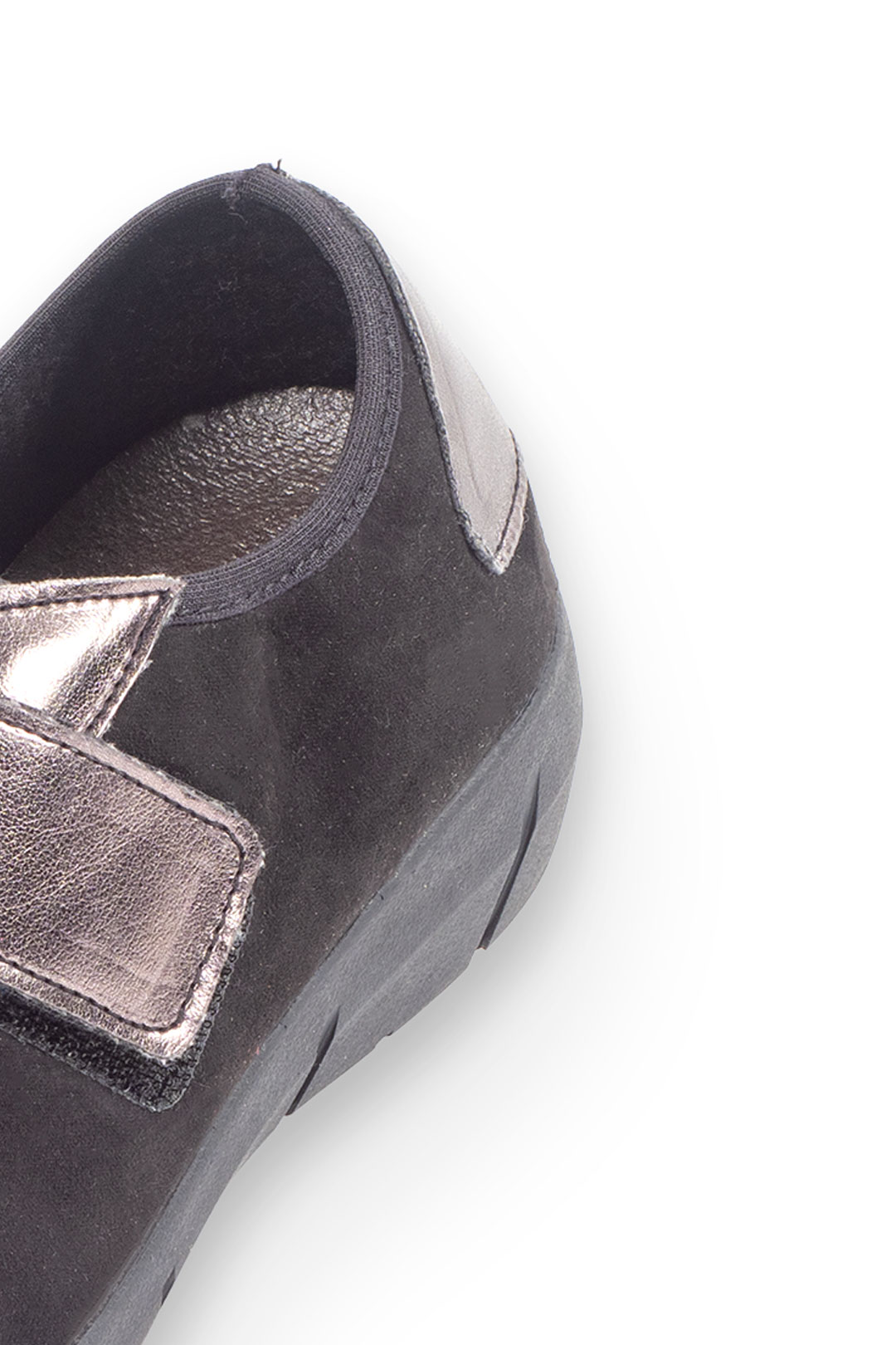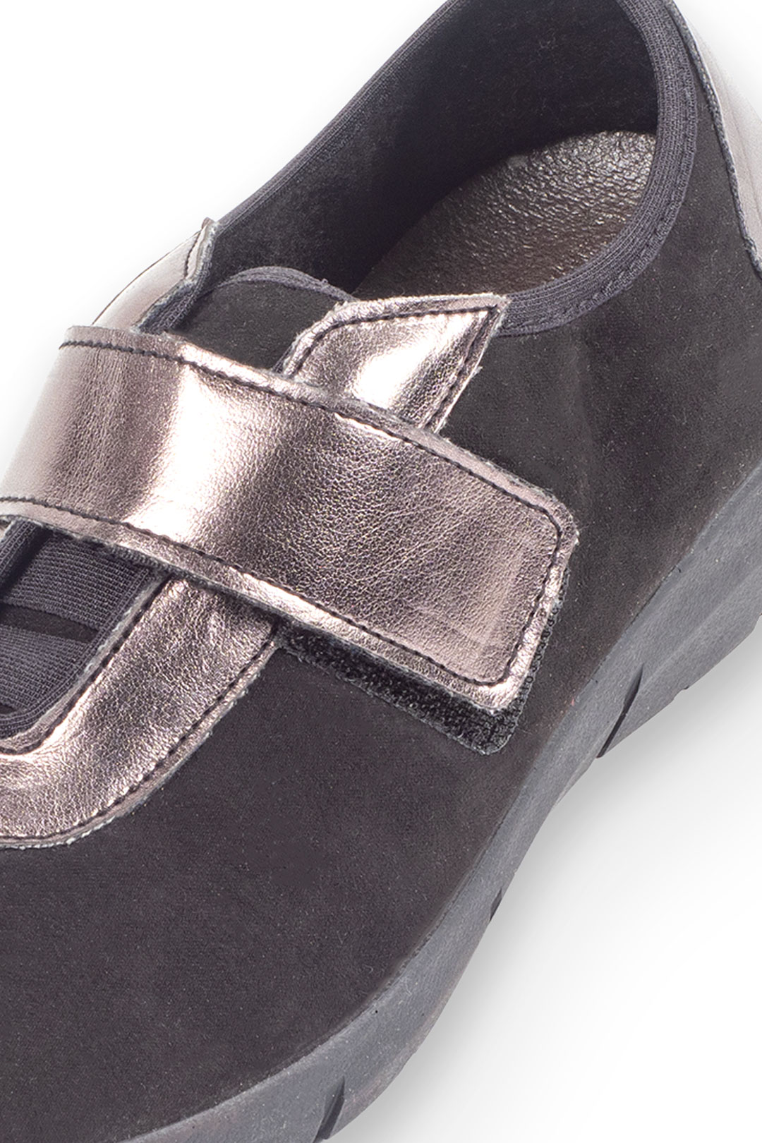 Zapatilla metalizada estilo clásico con corte en la pala, velcro para un mayor ajuste a cada tipo de pie y una ligera cuña.
