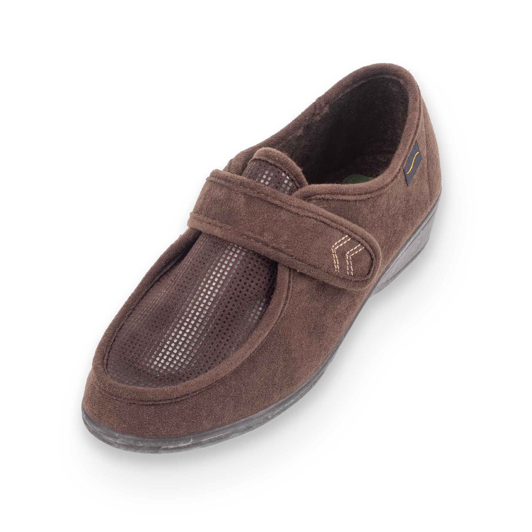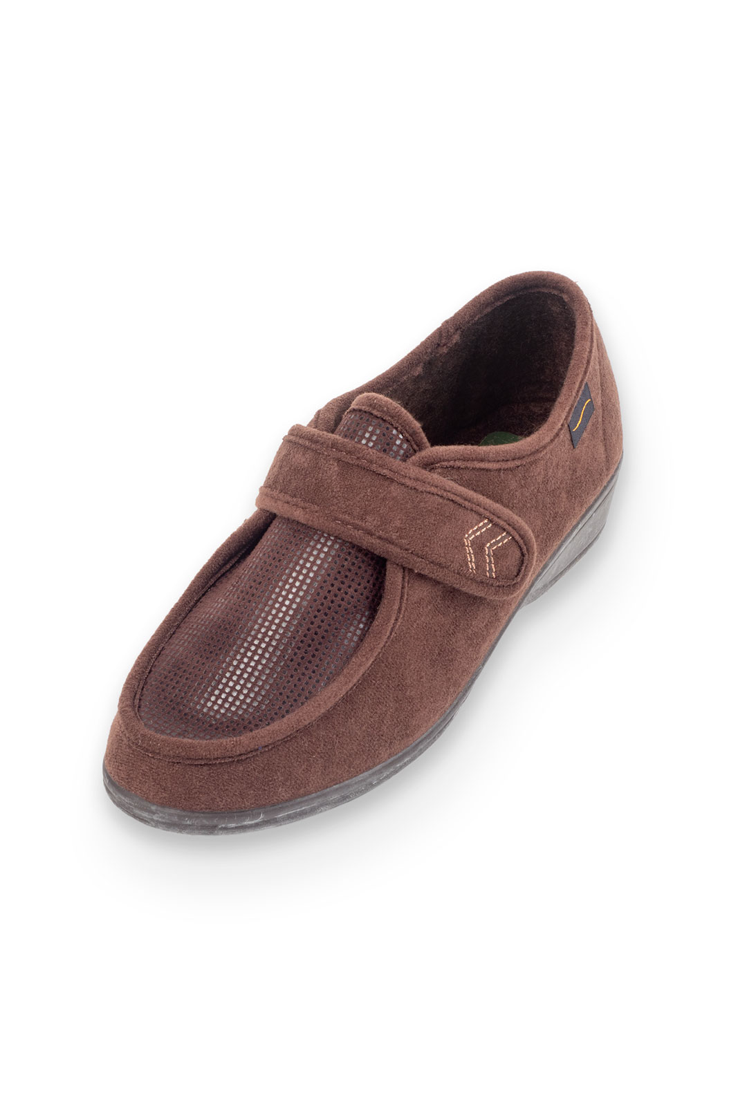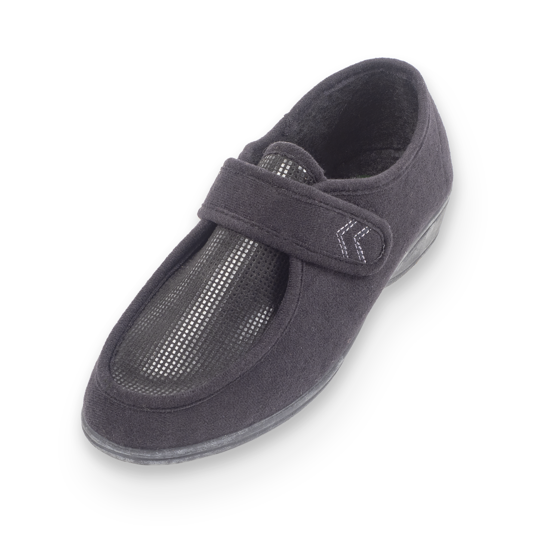 Zapatilla de señora con una ligera cuña, con la pala de licra para mayor confort y velcro para un mejor ajuste al pie