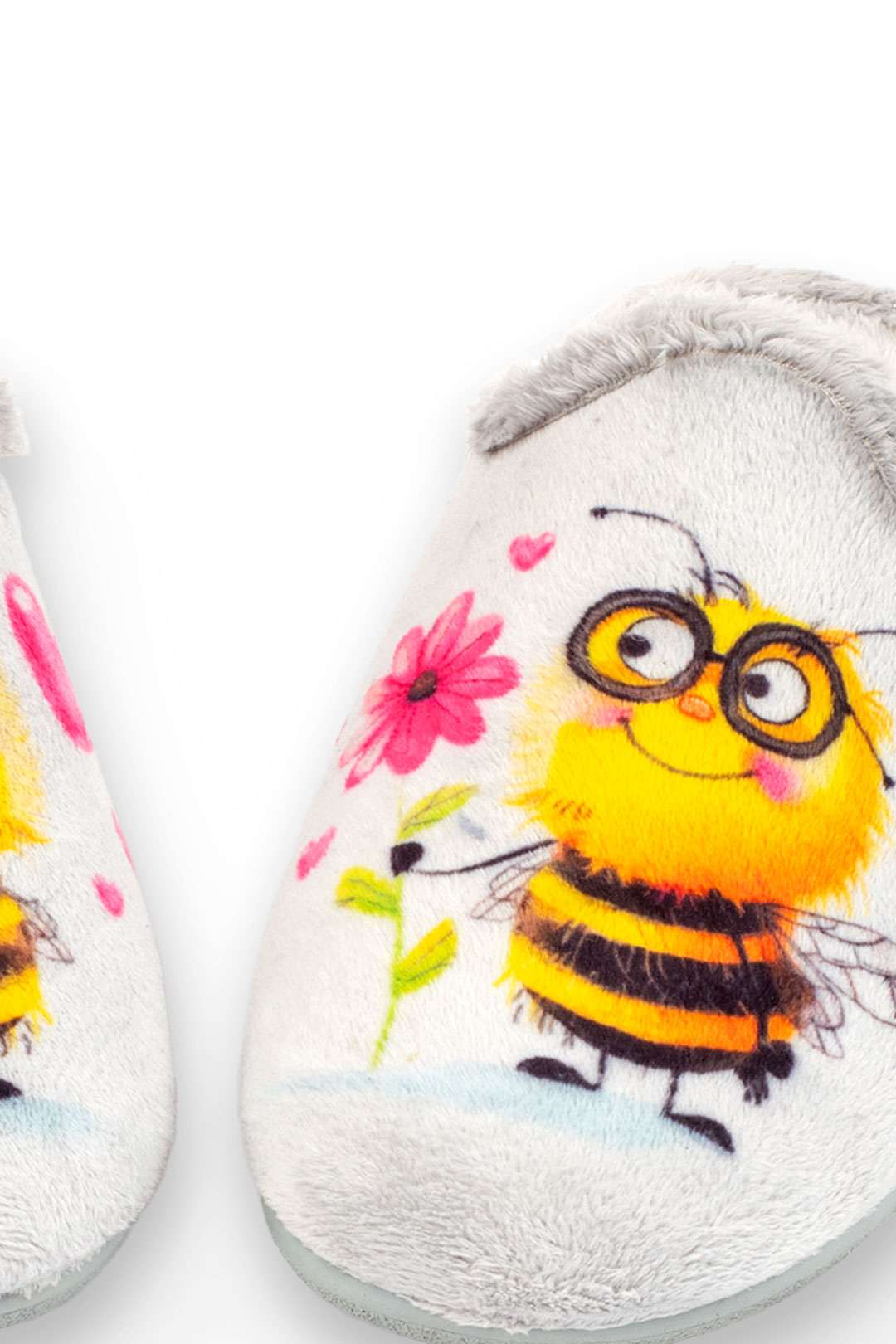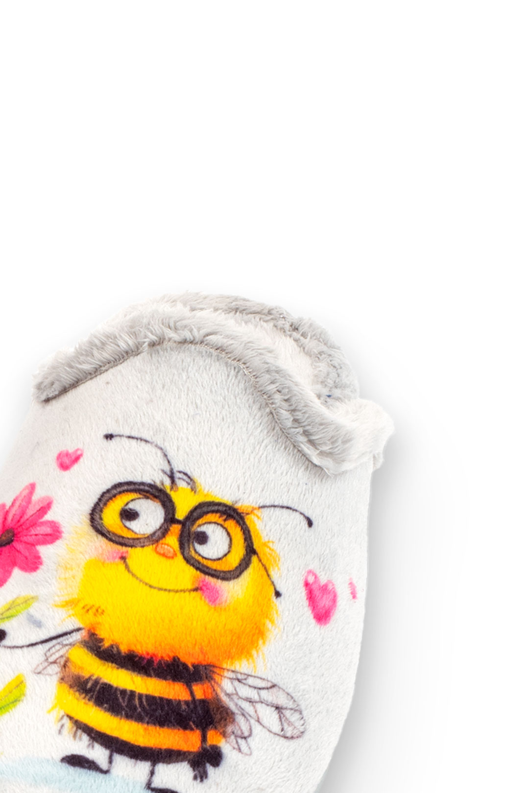 Chinela con serigrafía de abejitas tipo copete y suela de goma llana.